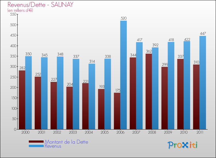Par rapport aux 663 habitants de Saunay, en 2011 le poids de cette dette représente 467 € par habitant.