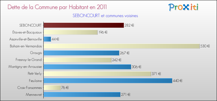A noter : la valeur moyenne de la dette par habitant des communes françaises similaires à Seboncourt était de 592 € par habitant, en 2011.