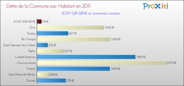 A Soisy-sur-Seine, la dette due par habitant de la commune en 2011 est donc moins élevée de 89.47 % que pour des communes similaires.