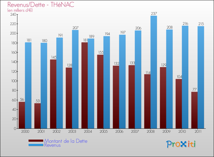 Par rapport aux 385 habitants de Thénac, en 2011 le poids de cette dette représente 200 € par habitant.