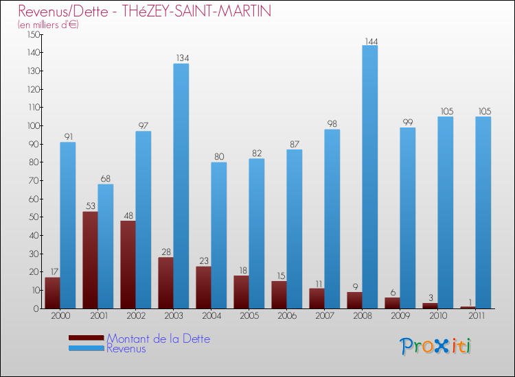 Comparaison Revenus/Dette de Thézey-Saint-Martin (de 2000 à 2011)
