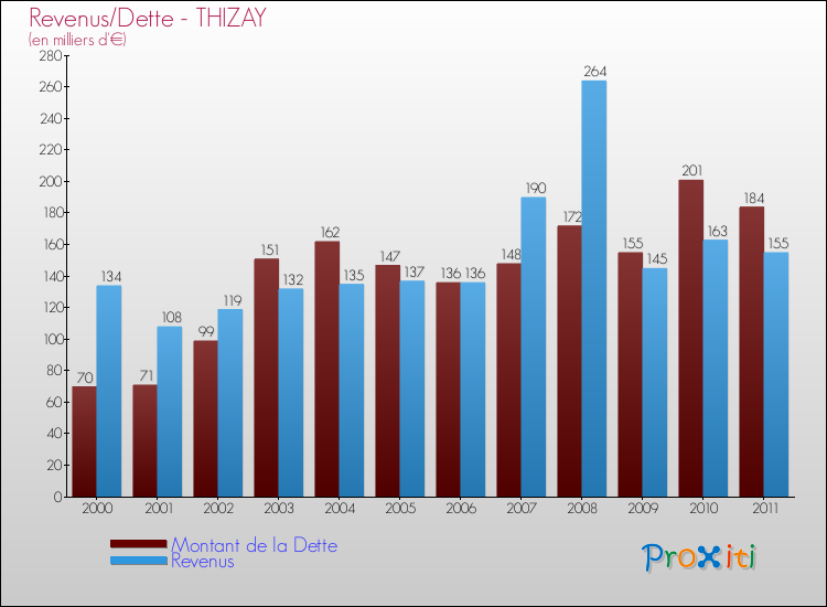 Par rapport aux 266 habitants de Thizay, en 2011 le poids de cette dette représente 690 € par habitant.