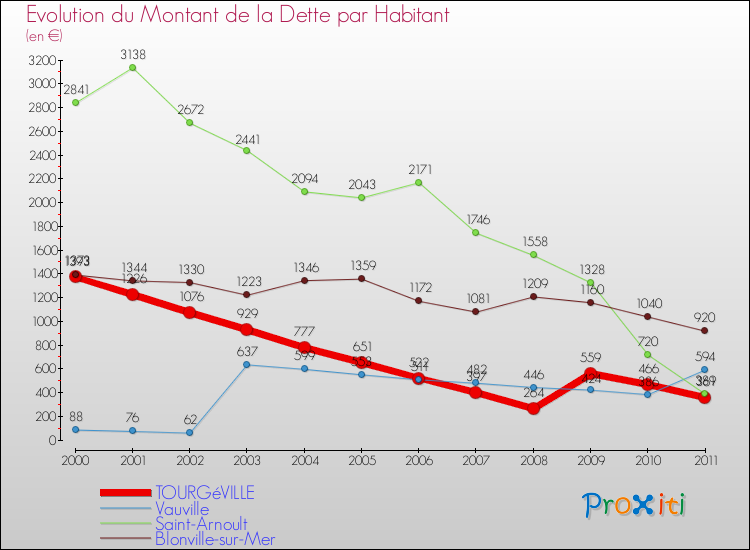 A Tourgéville, la dette par habitant a donc baissé de 73.71 % entre 2000 et 2011.