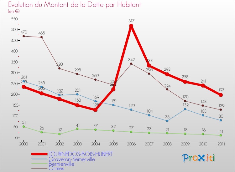A Tournedos-Bois-Hubert, la dette par habitant a donc baissé de 16.17 % entre 2000 et 2011.