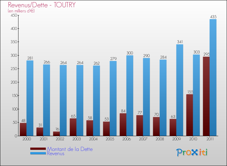 A Toutry, ce montant de la dette est en augmentation de 90.32 % par rapport à 2010.