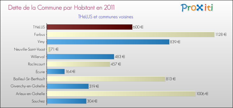 Par rapport aux 1 201 habitants de Thélus, en 2011 le poids de cette dette représente 600 € par habitant.