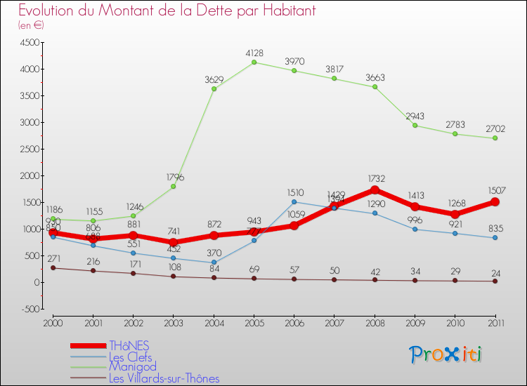 A Thônes, la dette par habitant a donc augmenté de 62.04 % entre 2000 et 2011.