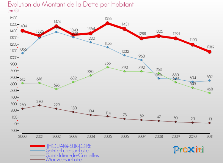 Par rapport aux 7 646 habitants de Thouaré-sur-Loire, en 2011 le poids de cette dette représente 1089 € par habitant.