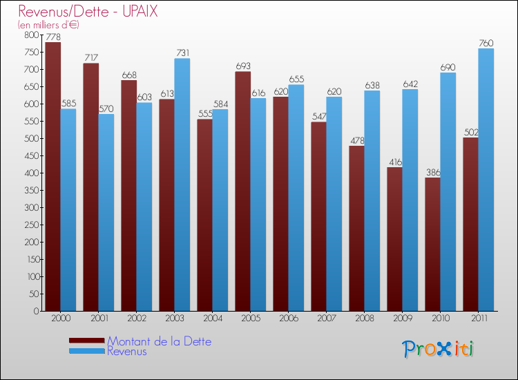 Comparaison Revenus/Dette de Upaix (de 2000 à 2011)