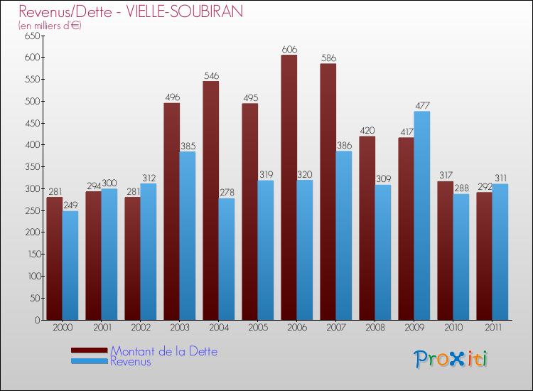 Comparaison Revenus/Dette de Vielle-Soubiran (de 2000 à 2011)