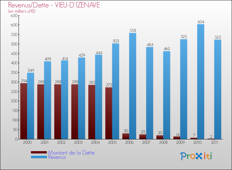 Comparaison Revenus/Dette de Vieu-d'Izenave (de 2000 à 2011)