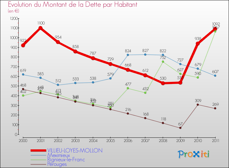 A Villieu-Loyes-Mollon, la dette par habitant a donc augmenté de 18.44 % entre 2000 et 2011.