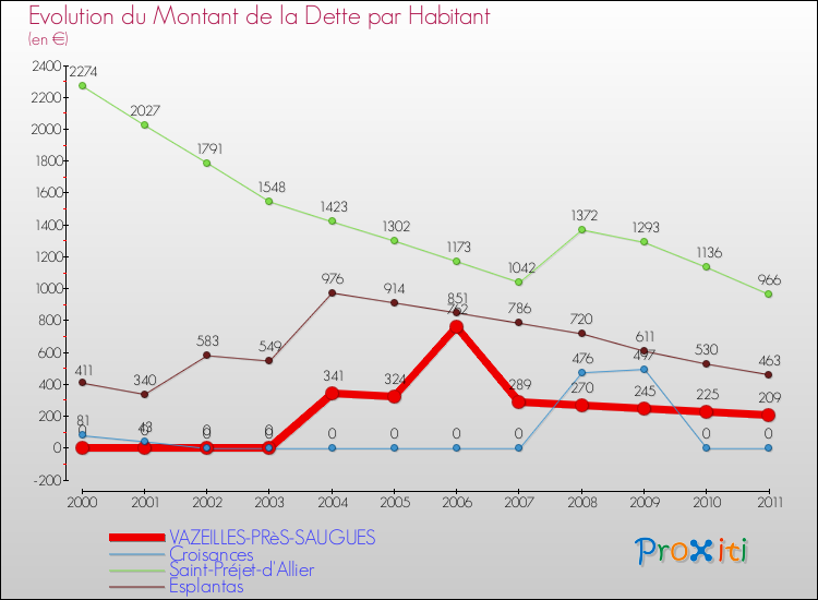 Le graphique ci-dessous représente l'évolution de la dette par habitant à Vazeilles-près-Saugues depuis 2000.