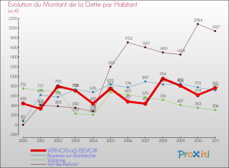A Vernois-lès-Belvoir, ce montant de la dette est en augmentation de 23.81 % par rapport à 2010.