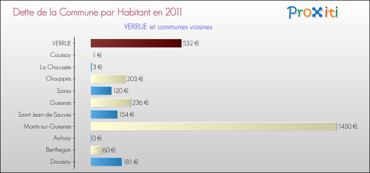 A Verrue, la dette due par habitant de la commune en 2011 est donc plus élevée de 1.72 % que pour des communes similaires.