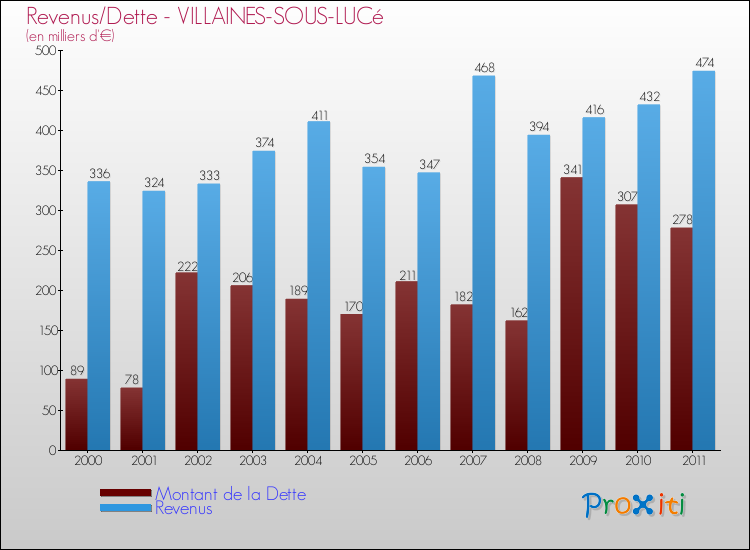 Comparaison Revenus/Dette de Villaines-sous-Lucé (de 2000 à 2011)
