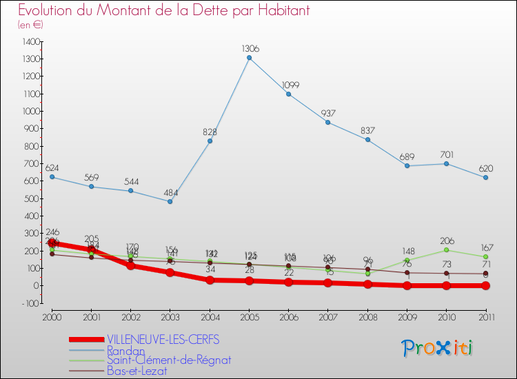 A Villeneuve-les-Cerfs, la dette par habitant a donc baissé de 100 % entre 2000 et 2011.
