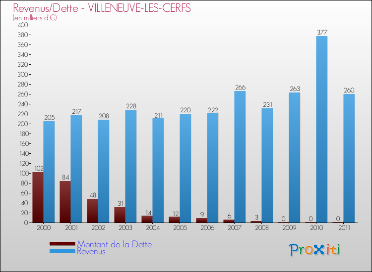 Comparaison Revenus/Dette de Villeneuve-les-Cerfs (de 2000 à 2011)