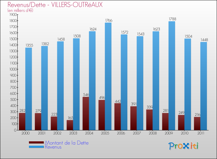 Comparaison Revenus/Dette de Villers-Outréaux (de 2000 à 2011)