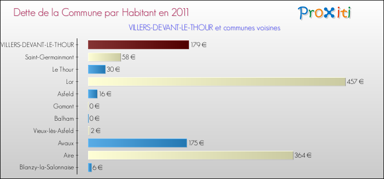 A Villers-devant-le-Thour, la dette due par habitant de la commune en 2011 est donc moins élevée de 63.69 % que pour des communes similaires.