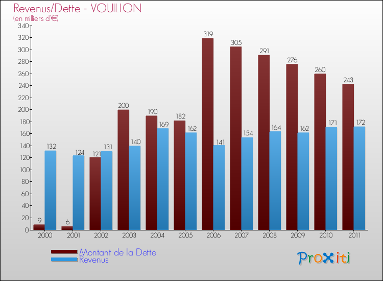 En 2011, le montant total des dettes dûes par la commune de Vouillon était de : 243 000 €.