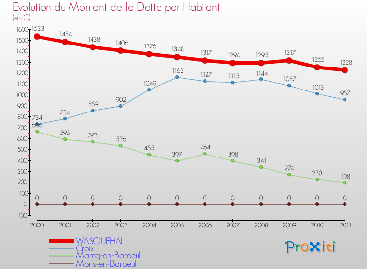 A Wasquehal, la dette par habitant a donc baissé de 19.9 % entre 2000 et 2011.