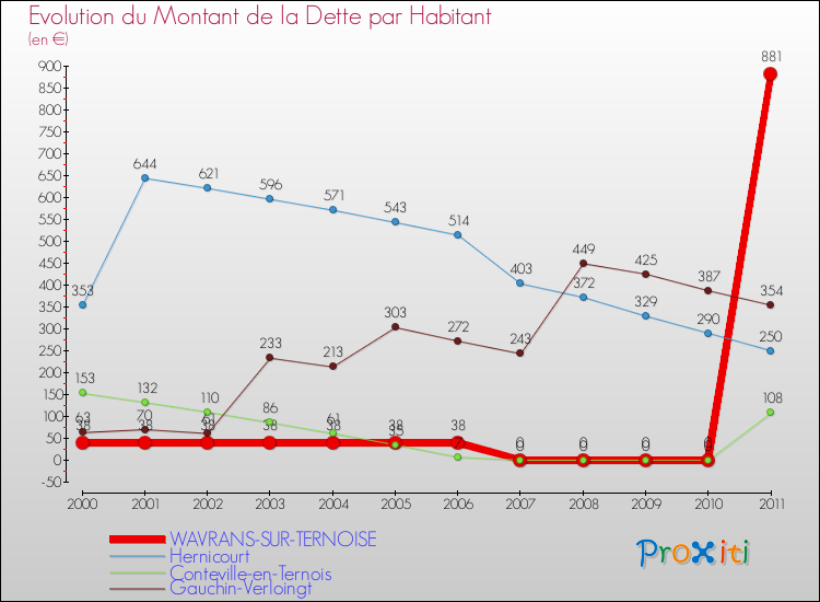A Wavrans-sur-Ternoise, la dette par habitant a donc augmenté de 2218.42 % entre 2000 et 2011.
