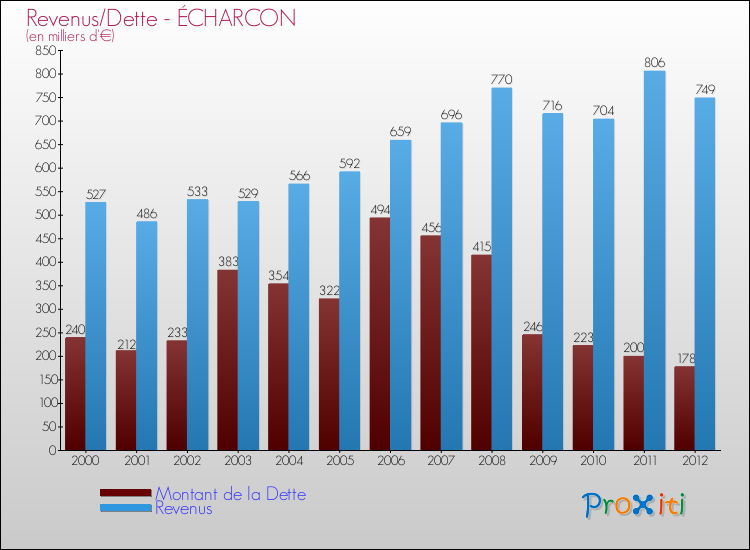 Comparaison Revenus/Dette de Écharcon (de 2000 à 2012)