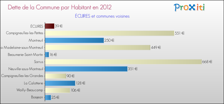 A noter : la valeur moyenne de la dette par habitant des communes françaises similaires à Écuires était de 596 € par habitant, en 2012.