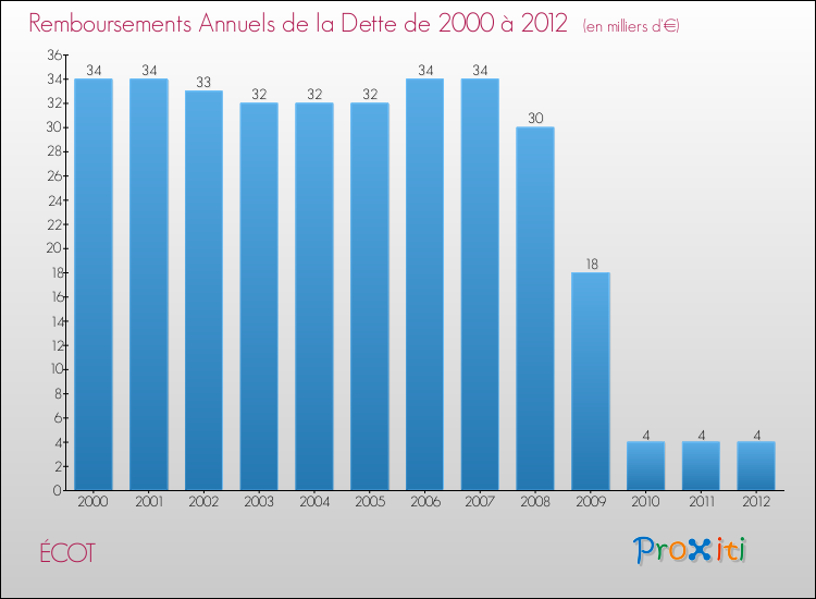 Par rapport aux 475 habitants de Écot, en 2012 le poids de cette dette représente 60 € par habitant.