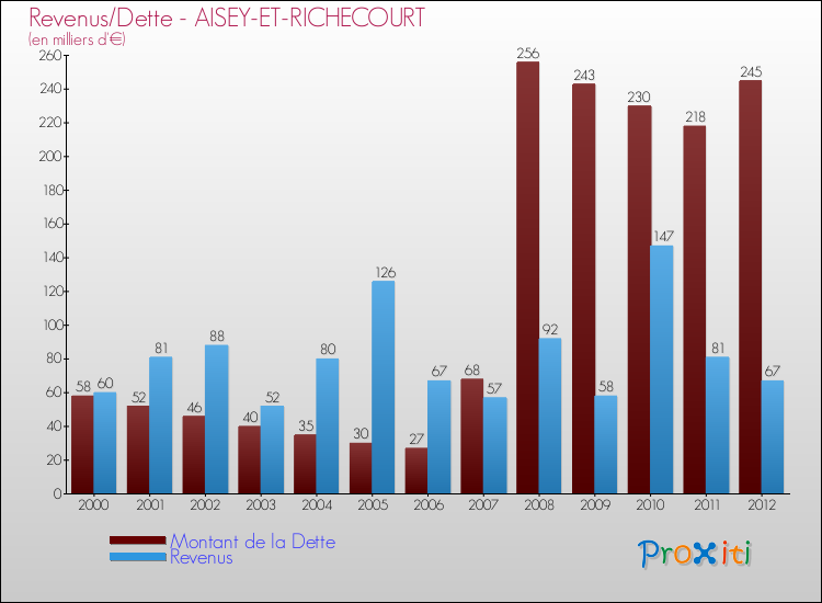 Comparaison Revenus/Dette de Aisey-et-Richecourt (de 2000 à 2012)