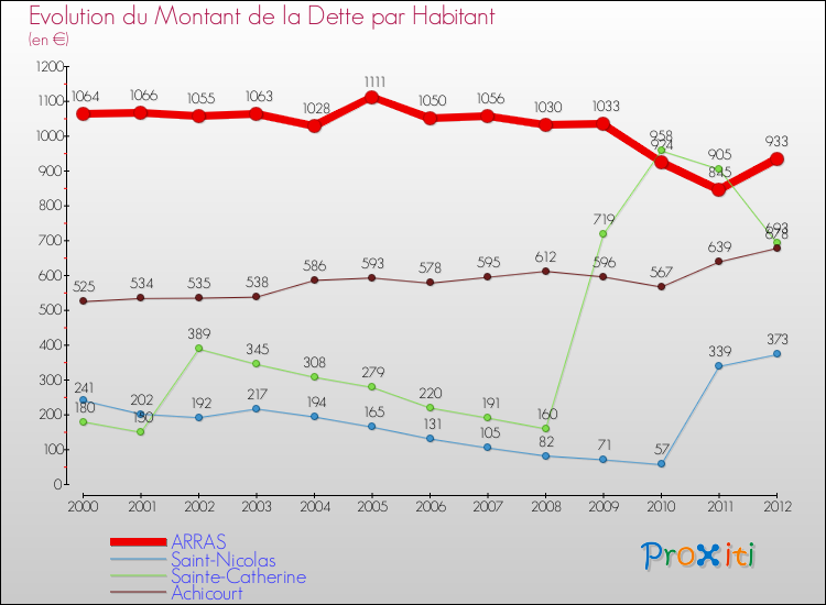 A Arras, ce montant de la dette est en augmentation de 8.92 % par rapport à 2011.