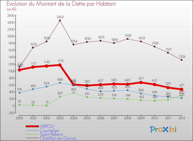Par rapport aux 1702 habitants de Arrou, en 2012 le poids de cette dette représente 471 € par habitant.