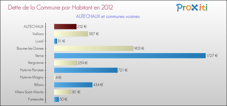 A Autechaux, la dette due par habitant de la commune en 2012 est donc moins élevée de 53.68 % que pour des communes similaires.