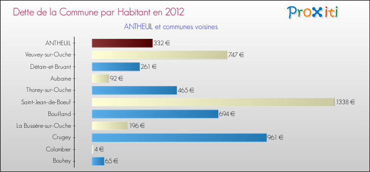 A Antheuil, la dette due par habitant de la commune en 2012 est donc moins élevée de 34.26 % que pour des communes similaires.