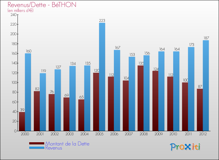 Par rapport aux 333 habitants de Béthon, en 2012 le poids de cette dette représente 263 € par habitant.