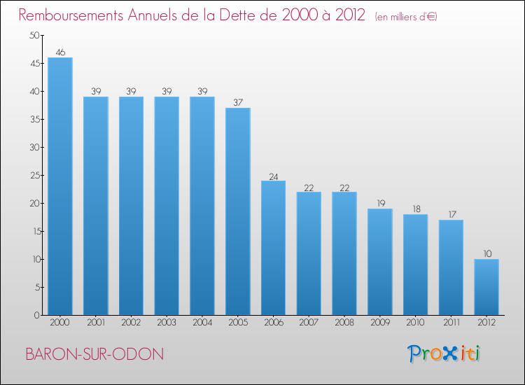 A Baron-sur-Odon, la dette par habitant a donc baissé de 99.23 % entre 2000 et 2012.