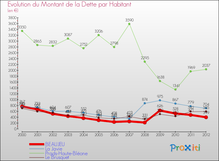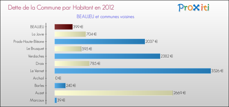 Par rapport aux 154 habitants de Beaujeu, en 2012 le poids de cette dette représente 399 € par habitant.