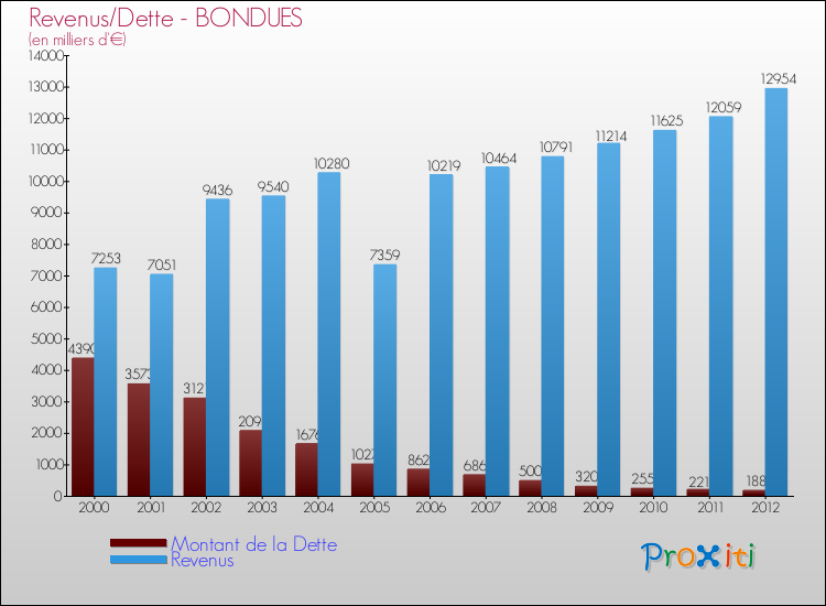 Comparaison Revenus/Dette de Bondues (de 2000 à 2012)