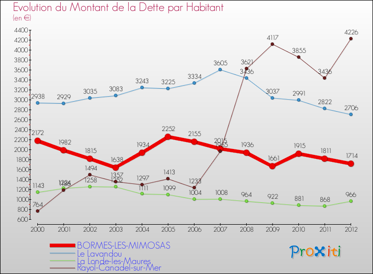 Par rapport aux 7430 habitants de Bormes-les-Mimosas, en 2012 le poids de cette dette représente 1714 € par habitant.