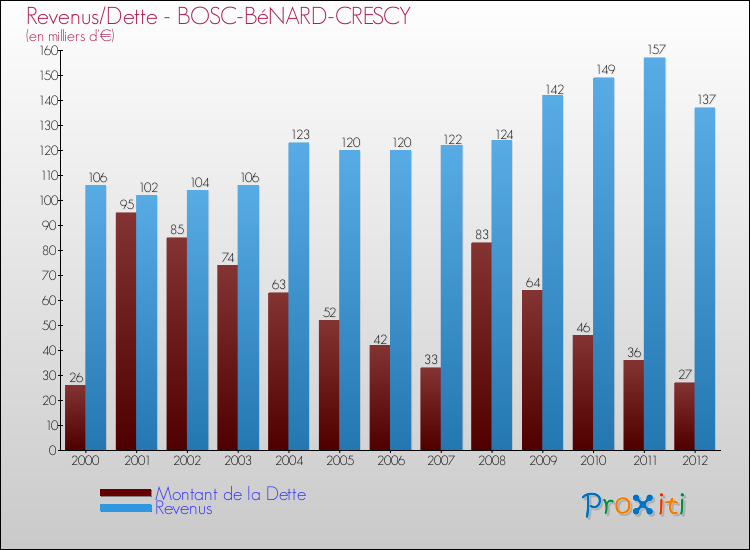 Comparaison Revenus/Dette de Bosc-Bénard-Crescy (de 2000 à 2012)