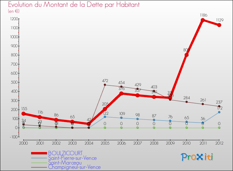 A Boulzicourt, la dette par habitant a donc augmenté de 628.39 % entre 2000 et 2012.