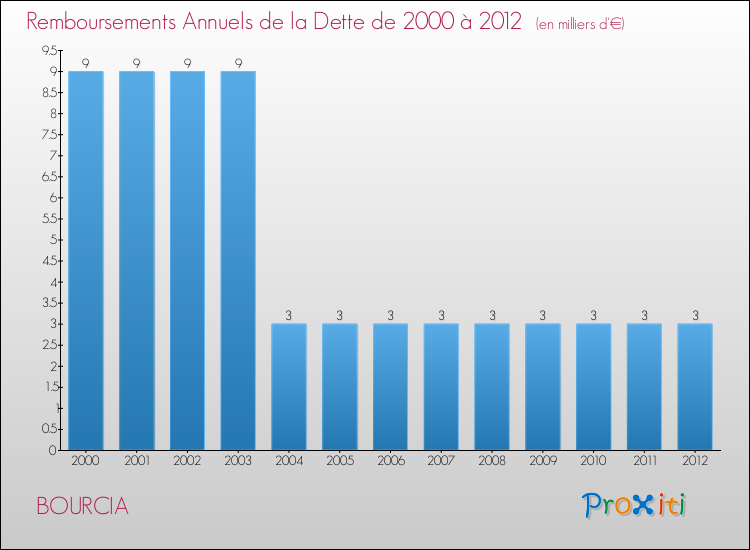 A Bourcia, la dette par habitant a donc baissé de 87.07 % entre 2000 et 2012.