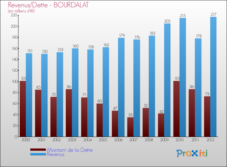 Par rapport aux 216 habitants de Bourdalat, en 2012 le poids de cette dette représente 337 € par habitant.