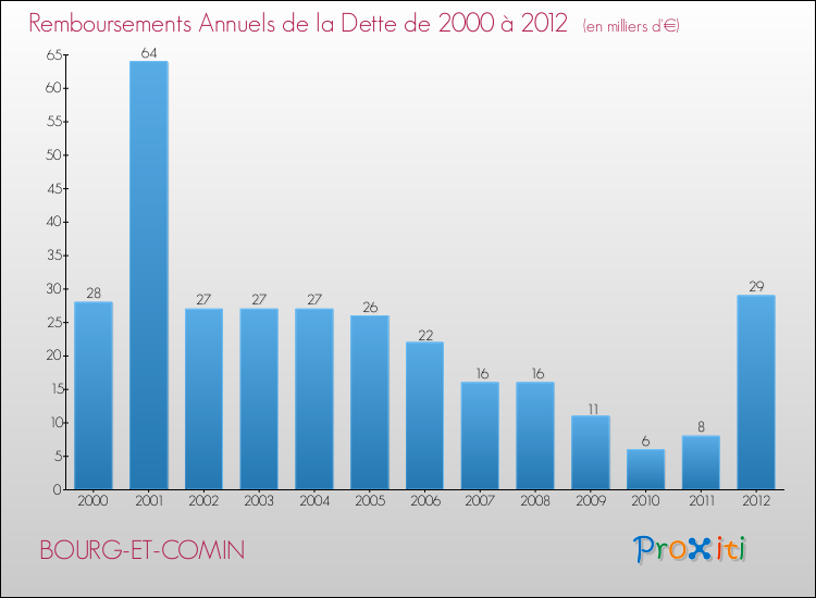 Pendant la même période, les communes françaises similaires à Bourg-et-Comin, ont vu leur dette par habitant augmenter de 27.22 % en moyenne entre 2000 et 2012.