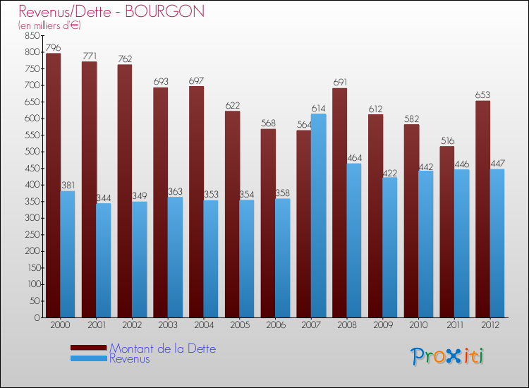 Comparaison Revenus/Dette de Bourgon (de 2000 à 2012)