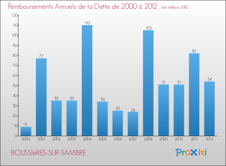 Par rapport aux 525 habitants de Boussières-sur-Sambre, en 2012 le poids de cette dette représente 1094 € par habitant.