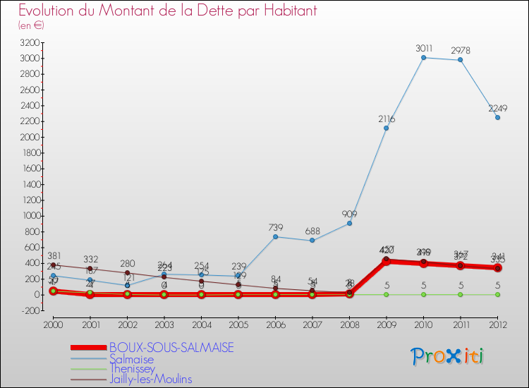 Pendant la même période, les communes françaises similaires à Boux-sous-Salmaise, ont vu leur dette par habitant augmenter de 24.08 % en moyenne entre 2000 et 2012.