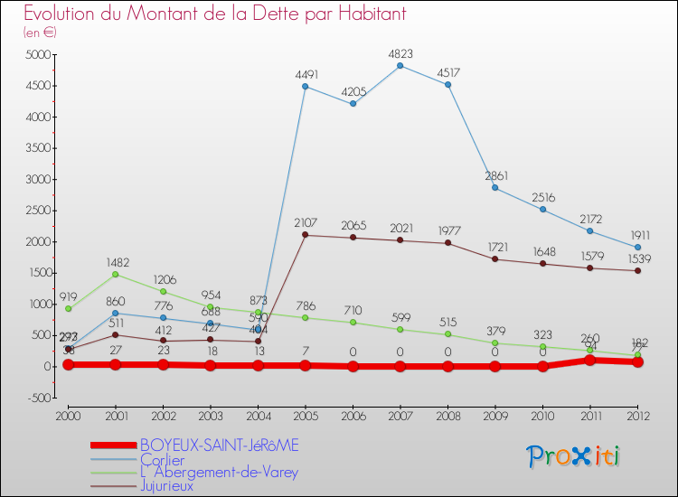 Pendant la même période, les communes françaises similaires à Boyeux-Saint-Jérôme, ont vu leur dette par habitant augmenter de 34.96 % en moyenne entre 2000 et 2012.