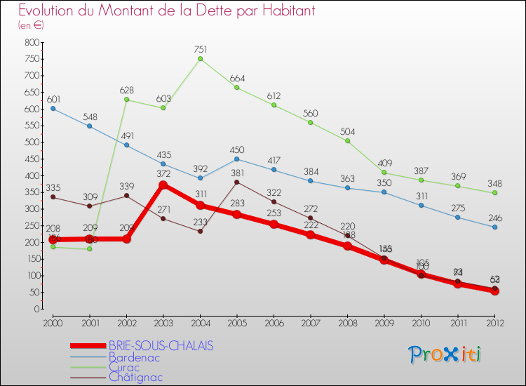 A Brie-sous-Chalais, la dette par habitant a donc baissé de 74.52 % entre 2000 et 2012.
